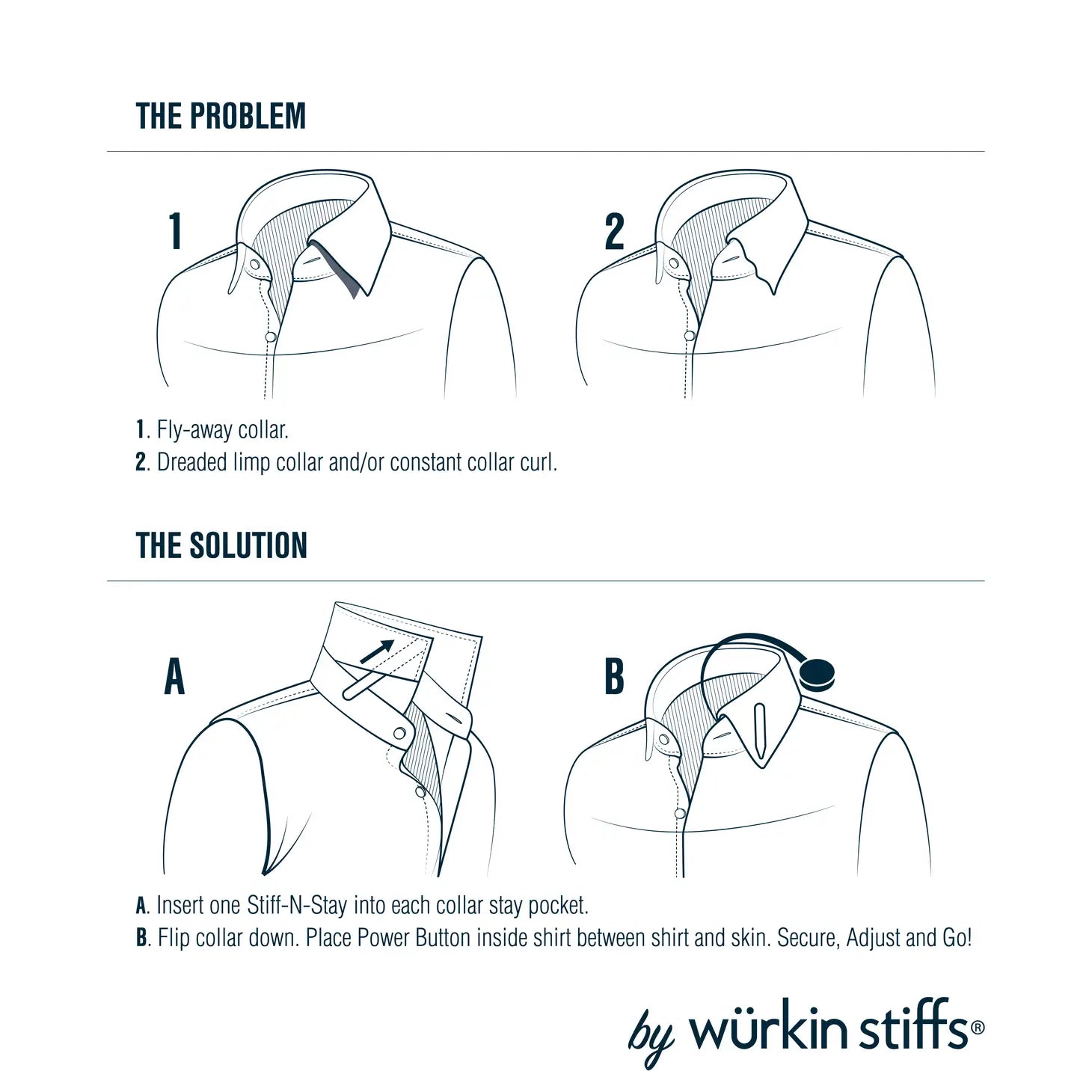 Is your collar flapping in the wind like the wings of a disco duck? Wish you could take off that tie and still look crisp and well put together? We have what you need, our patented Power Stays will tame those collars and give you the freedom to position them just right no matter how unruly the collar.